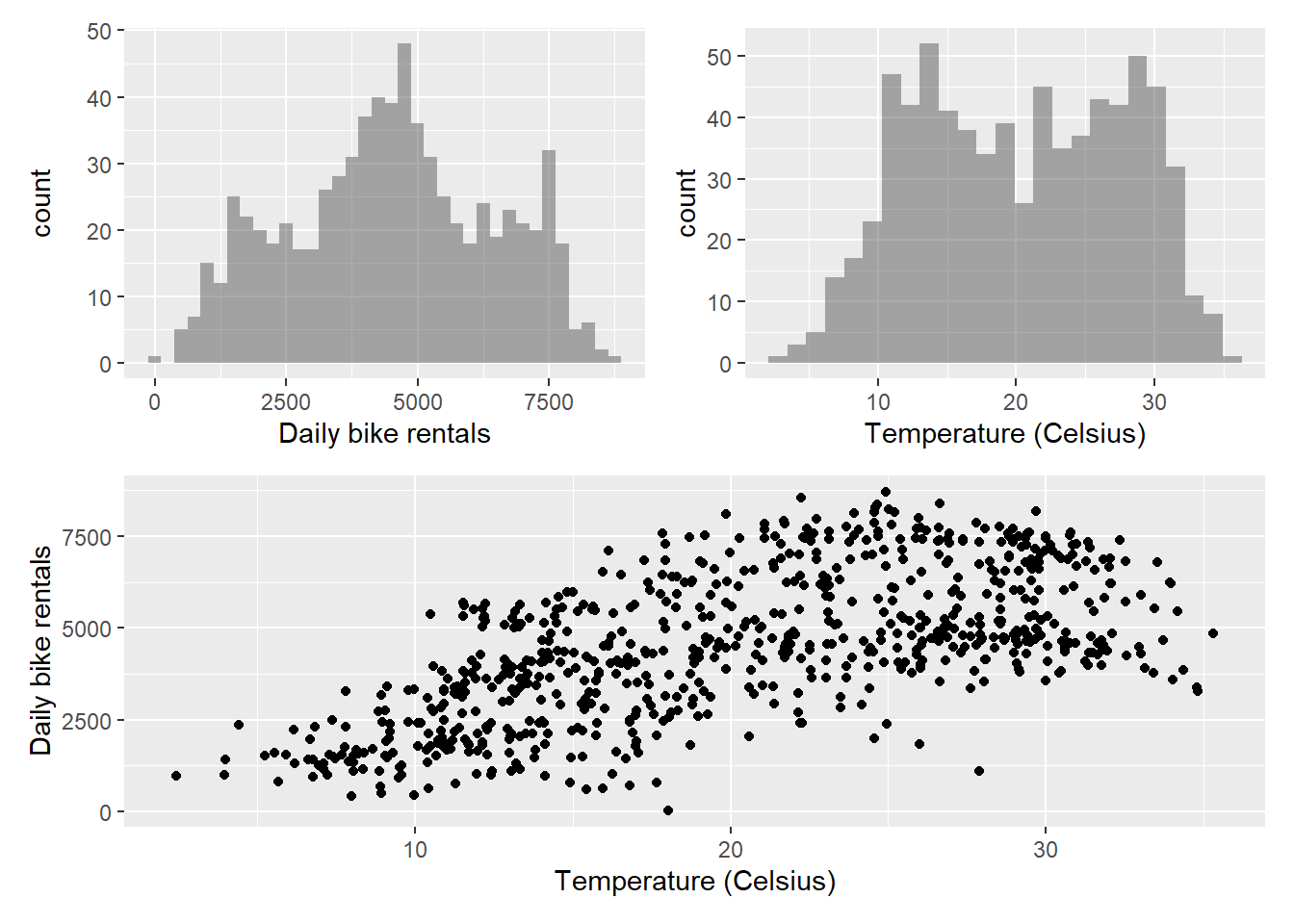 Below are visualizations of the distributions of daily bike rentals and temperature as well as the relationship between these two variables.