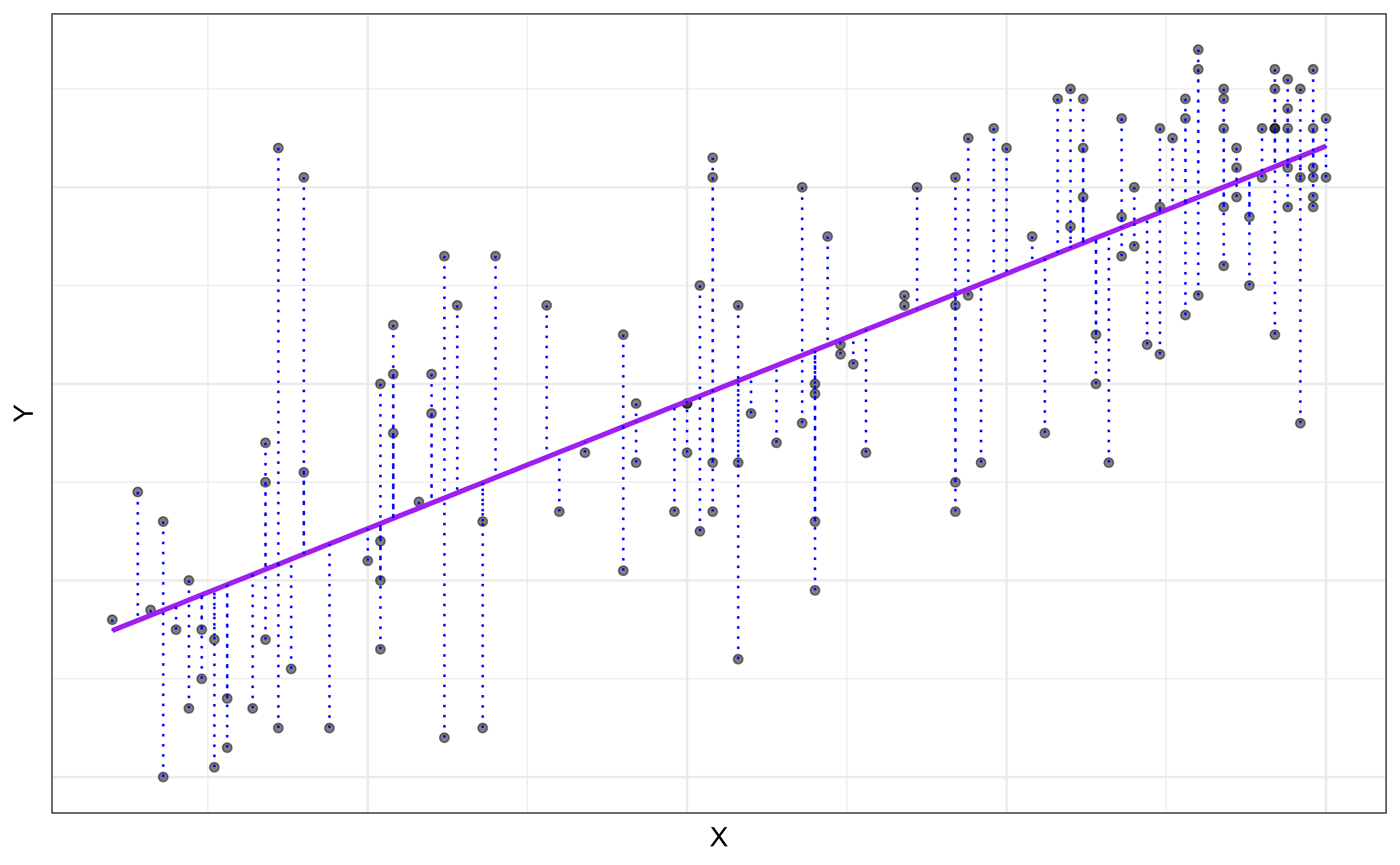 \[ \begin{aligned} Y &= \color{purple}{\textbf{Model}} + \color{blue}{\textbf{Error}} \\[5pt] &= \color{purple}{\mathbf{f(X)}} + \color{blue}{\boldsymbol{\epsilon}} \\[5pt] &= \color{purple}{\boldsymbol{\mu_{Y|X}}} + \color{blue}{\boldsymbol{\epsilon}} \\[5pt] \end{aligned} \]