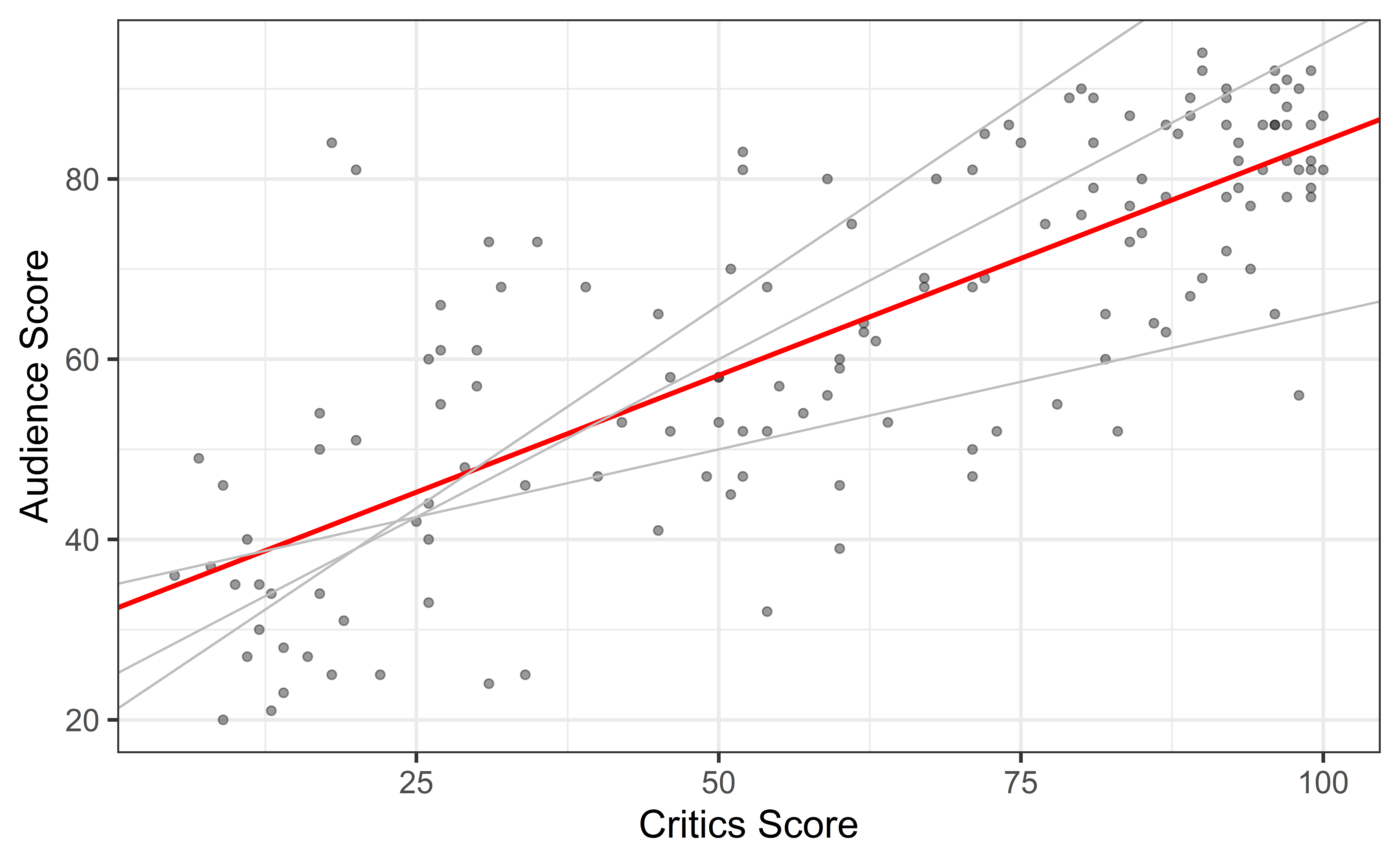 Goal: Fit a line to describe the relationship between the critics score and audience score.